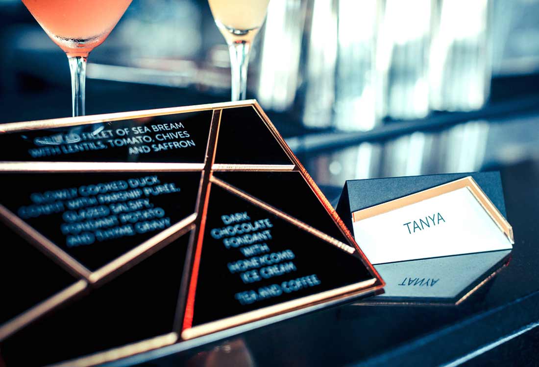 This elegant modern place setting using two pieces of card along with a gold mirror perspex accent to create a chic place setting.