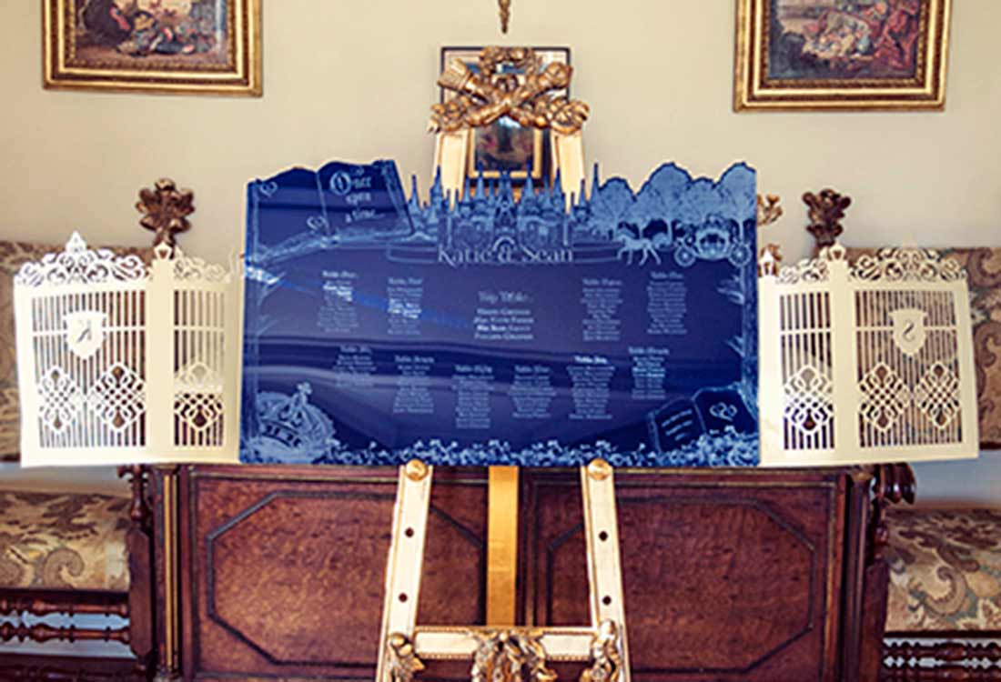 This elaborate seating plan uses laser-cut and engraved blue Perspex featuring a detailed fairytale scene including a castle, storybook and horse and carriage. The seating chart was finished with oversized laser-cut card gates.